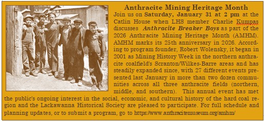 Sat., Jan. 31, 2 pm; Anthracite Breaker Boys at the Catlin House when LHS member Charlie Kumpas discusses Anthracite Breaker Boys as part of the 2026 Anthracite Mining Heritage Month (AMHM). AMHM marks its 25th anniversary in 2026. According to program founder, Robert Wolensky, it began in 2001 as Mining History Week in the northern anthracite coalfield’s Scranton/Wilkes-Barre areas and has steadily expanded since, with 27 different events presented last January in more than two dozen communities across all three anthracite fields (northern, middle, and southern). This annual event has met the public’s ongoing interest in the social, economic, and cultural history of the hard coal region and the Lackawanna Historical Society are pleased to participate. Click Here for full schedule and planning updates, or to submit a program.