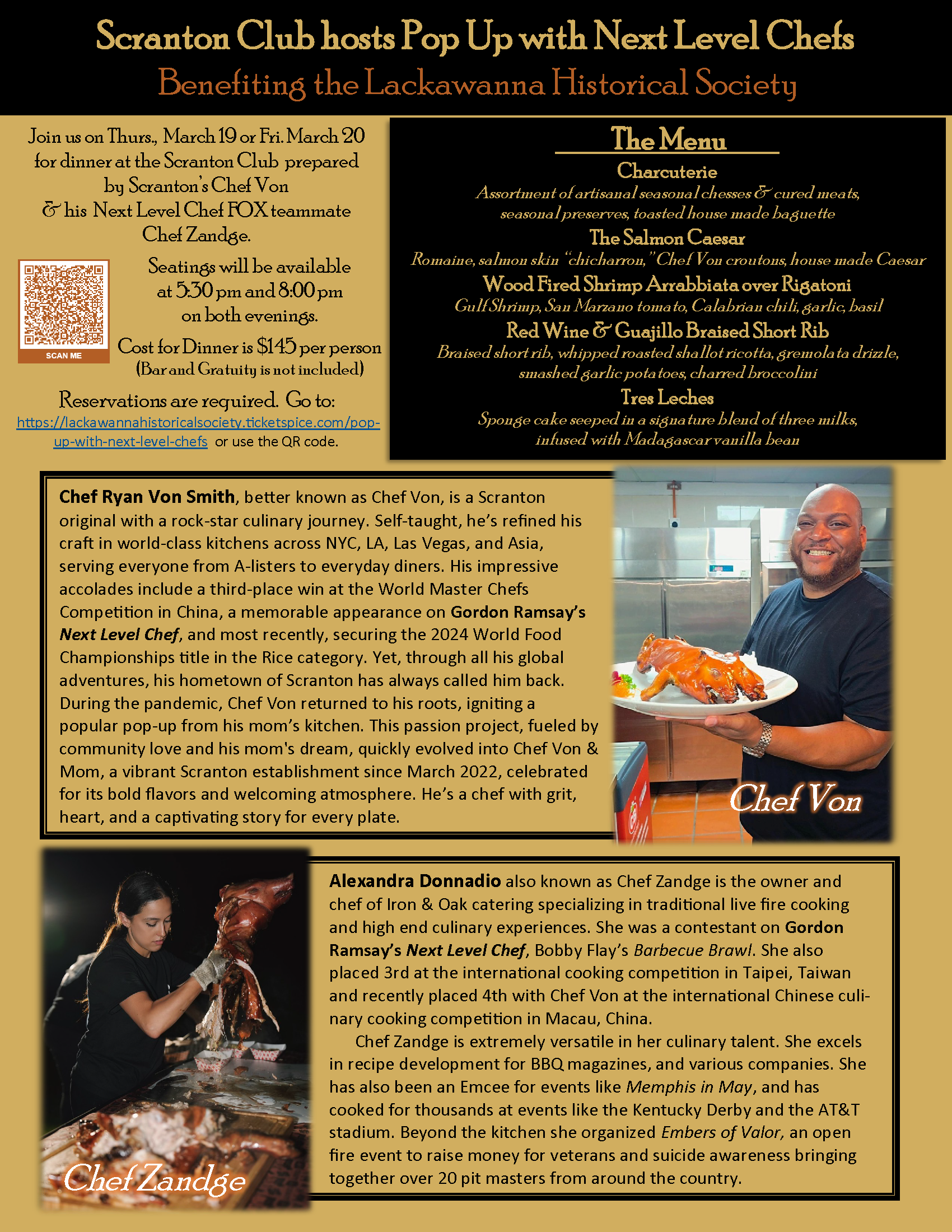 Wed., Apr. 15; Dine Lackawanna - at AV Restaurant 320 Penn Ave, Scranton, (570) 457-5800, Enjoy a night out & help support the Society by dining out at supporting locations!