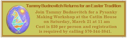 Sat., Mar. 21, 11 am; Pysanky Making Workshop - Tammy Budnovitch Returns for an Easter Tradition Join us for a Pysanky Making Workshop at the Catlin House on Saturday, March 21 at 11 am Cost is $30 per person and registration is required by calling 570-344-3841.